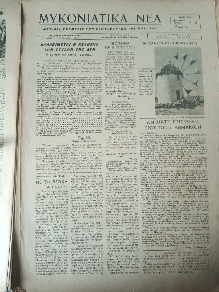 Το ζήτημα των κολωνών ηλεκτροδότησης δεν είναι σημερινό για τη Μύκονο, καθώς απασχολούσε έντονα το νησί ήδη από τη δεκαετία του ’60, όπως αποδεικνύεται από δημοσίευμα της εφημερίδας «Μυκονιατικά Νέα» της 30ης Σεπτεμβρίου 1960 με τίτλο «Απαλείφθη η ασχημία των στύλων της ΔΕΗ». Στο συγκεκριμένο άρθρο καταγράφονται οι τότε αντιδράσεις των κατοίκων και φορέων, με χαρακτηρισμούς που έκαναν λόγο για «ασχημία» και αισθητική αλλοίωση του τοπίου από τους στύλους ρεύματος. Γίνεται αναφορά σε παρεμβάσεις του «Ομίλου Φίλων Μυκόνου», σε διαμαρτυρίες και σε επιστολές προς το Υπουργείο Βιομηχανίας, με στόχο να προστατευτεί η παραδοσιακή φυσιογνωμία του νησιού και να αποφευχθεί η οπτική επιβάρυνση του κυκλαδίτικου τοπίου.