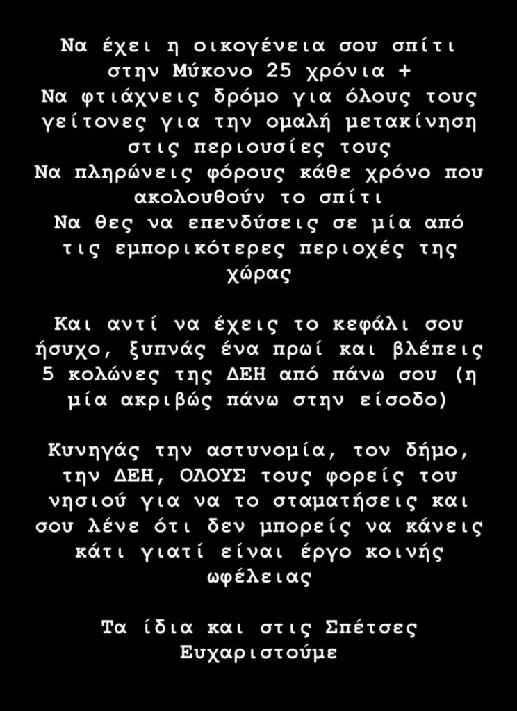 Όπως έγραψε χαρακτηριστικά: «Να έχει η οικογένειά σου σπίτι στην Μύκονο 25 χρόνια+. Να φτιάχνεις δρόμο για όλους τους γείτονες για την ομαλή μετακίνηση στις περιουσίες τους. Να πληρώνεις φόρους κάθε χρόνο που ακολουθούν το σπίτι. Να θες να επενδύσεις σε μία από τις εμπορικότερες περιοχές της χώρας. Και αντί να έχεις το κεφάλι σου ήσυχο, ξυπνάς ένα πρωί και βλέπεις 5 κολώνες της ΔΕΗ από πάνω σου, η μία ακριβώς πάνω στην είσοδο. Κυνηγάς την αστυνομία, τον Δήμο, την ΔΕΗ, όλους τους φορείς του νησιού για να το σταματήσεις και σου λένε ότι δεν μπορείς να κάνεις κάτι γιατί είναι έργο κοινής ωφέλειας. Τα ίδια και στις Σπέτσες, ευχαριστούμε».