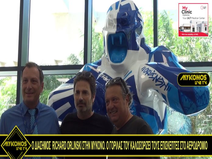 Ένα τεράστιος άγριος γορίλας σε μπλε, γαλάζιο και λευκό χρώμα, ο οποίος φέρει την υπογραφή του εικαστικού Richard Orlinski υποδέχεται εδώ και λίγες ώρες τους επισκέπτες στο αεροδρόμιο της Μυκόνου. Τα αποκαλυπτήρια του εντυπωσιακού γλυπτού έγιναν χθες 19 Ιουλίου παρουσία του διάσημου Γάλλου καλλιτέχνη, ο οποίος έφτασε με ιδιωτικό αεροσκάφος στο νησί των ανέμων όπου τον υποδέχθηκαν ο γνωστός γκαλερίστας Βαγγέλης Καπόπουλος και ο γιος του, Γρηγόρης. Σήμερα 20 Ιουλίου πραγματοποιούνται τα εγκαίνια της γκαλερί Orlinski, της μοναδικής στην Ελλάδα, που άνοιξε ήδη τις πύλες της στην Χώρα της Μυκόνου σε συνεργασία με την Kapopoulos Fine Arts. Ο κορυφαίος διεθνής καλλιτέχνης της σύγχρονης τέχνης Richard Orlinski εμπιστεύθηκε την δημιουργία της γκαλερί που είναι αφιερωμένη στο έργο του, και λειτουργεί στο πρότυπο των αντίστοιχων Galleries Orlinski που βρίσκονται σε μεγάλες μητροπόλεις του κόσμου, όπως το Μαϊάμι, το Παρίσι, το Λονδίνο, στην Kapopoulos Fine Arts, με την οποία συνεργάζεται αποκλειστικά για την Ελλάδα. Η γκαλερί Orlinski στην Μύκονο φιλοξενεί χαρακτηριστικά έργα με την υπογραφή του διεθνούς γλύπτη, με πρώτα τα περίφημα άγρια ζώα του. Γορίλες στο εντυπωσιακό μπλε του κοβαλτίου, λαμπερές αρκούδες, πολύχρωμοι δεινόσαυροι, εκτυφλωτικοί πάνθηρες και άλλα που μοιάζουν να το έσκασαν μόλις από το φυσικό τους περιβάλλον. Ο καλλιτέχνης δουλεύει με διάφορα υλικά και μέσα, δημιουργώντας κυρίως μονοχρωματικά τοτέμ, σε πέτρα, μάρμαρο, χρώμιο και γυαλισμένο μπρούντζο. Σε καθένα από αυτά τα γλυπτά η υφή και η αντίθεση των υλικών είναι μέρος της εργασίας, όπως και η ίδια η μορφή. Η τέχνη του Richard Orlinski κοσμεί περισσότερες από 90 γκαλερί στην Γαλλία και στο εξωτερικό ενώ από το 2015 κατέχει τον τίτλο του Γάλλου σύγχρονου καλλιτέχνη με τις περισσότερες πωλήσεις έργων στον κόσμο με το πελατολόγιό του να απαρτίζεται από μεγάλους συλλέκτες και rich & famous.