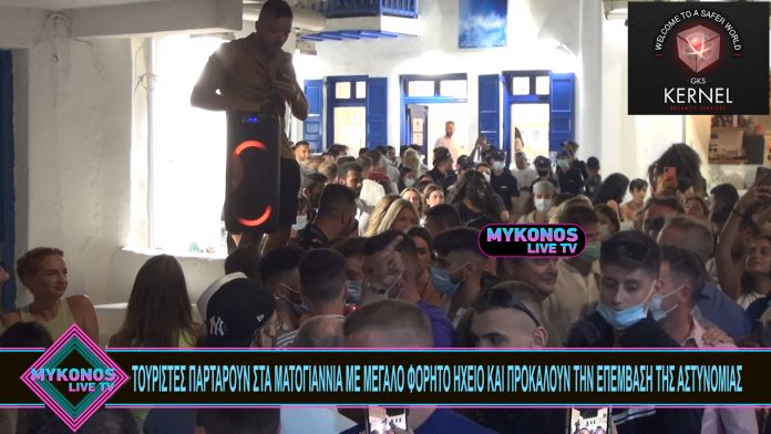 Με την μουσική στα νυχτερινά κέντρα της Μυκόνου να απαγορεύεται καθόλη την διάρκεια του 24ώρου μέχρι τις 26 Ιουλίου οι τουρίστες βρήκαν εναλλακτικό τρόπο διασκέδασης. Παρτάρουν στα Ματογιάννια με φορητά ηχεία! Με ένα τέτοιο ηχείο και μάλιστα ευμέγεθες μια παρέα ξεσήκωσε τα σοκάκια και προκάλεσε την επέμβαση της Αστυνομίας. Με την μουσική να δονεί την ατμόσφαιρα στα στενά οι περαστικοί άρχισαν να λικνίζονται και το αυτοσχέδιο πάρτυ ξεκίνησε, ωστόσο δεν κράτησε για πολύ καθώς άνδρες της Αστυνομίας που έκαναν περιπολία στην περιοχή επενέβησαν ώστε οι τουρίστες να συμμορφωθούν.