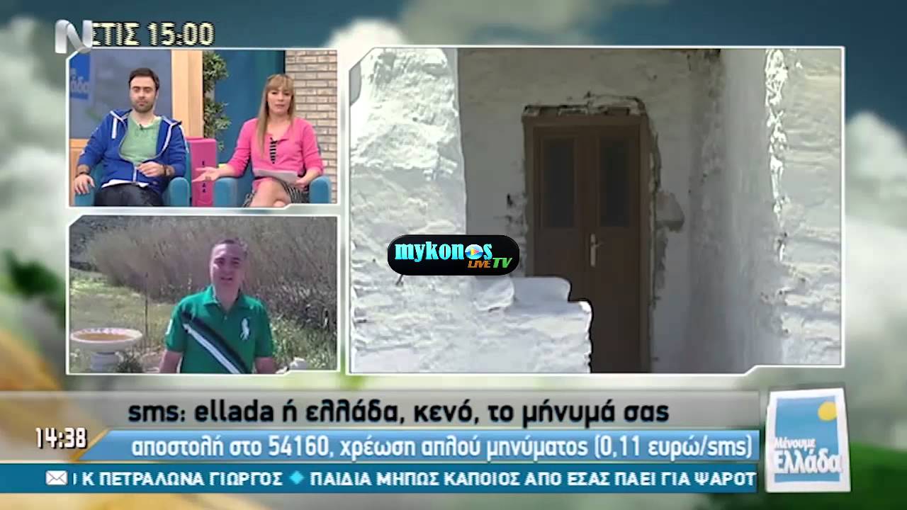 Η Μύκονος ήταν ένα από τα θέματα της δημοφιλούς εκπομπής της δημόσιας τηλεόρασης «Μένουμε Ελλάδα» που προβλήθηκε την Δευτέρα 30 Μαρτίου 2015. Ο δημοσιογράφος και ιδιοκτήτης του καναλιού Μykonos Live Tv, Πέτρος Νάζος, σε ζωντανή σύνδεση από το νησί των Ανέμων παρουσίασε όλα τα τελευταία νέα από το κοσμοπολίτικο κυκλαδονήσι, το οποίο αυτή την εποχή θυμίζει ένα απέραντο εργοτάξιο, καθώς επικρατεί οργασμός προετοιμασιών ενόψει της τουριστικής σαιζόν. Ο κ. Νάζος αναφέρθηκε στην άφιξη το ερχόμενο καλοκαίρι δύο παγκόσμιων κολοσσών στην Μύκονο, της διάσημης φίρμας εσωρούχων Victoria’s Secret, η οποία θα ανοίξει το πρώτο της κατάστημα στην Ελλάδα, αλλά και του περίφημου εστιατορίου κινεζικής κουζίνας Hakkasan, που θα φιλοξενηθεί στον χώρο του Φιλιππή και είναι βέβαιο ότι θα προσελκύσει την αφρόκρεμα της διεθνούς και εγχώριας showbiz. Αναφορά έκανε και στο ανακαινισμένο υποκατάστημα της αλυσίδας σούπερ μάρκετ Flora Markets, το οποίο θεωρείται το πιο trendy σε ολόκληρο τον πλανήτη, αφού διαθέτει dj που παίζει μουσική και γιγαντοοθόνη που πρόβάλλει το πρόγραμμα του Fashion Tv, ενώ η κάβα του φιλοξενεί σπανιότατες συλλογές κρασιών και ποτών.